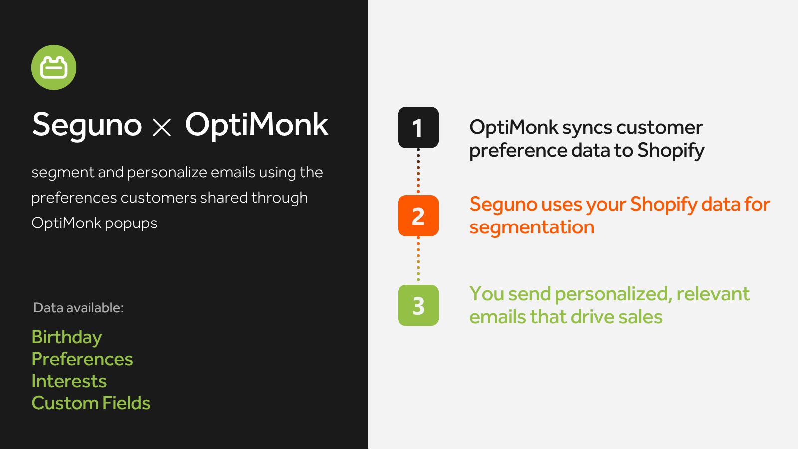 OptiMonk captures what your customers care about. Seguno turns it into emails that convert — all within Shopify.