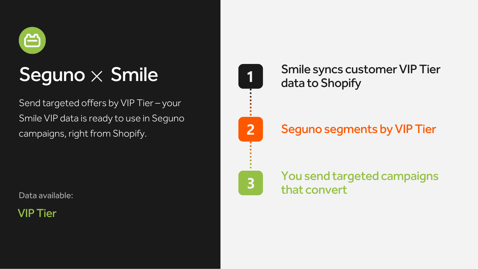 Smile tracks your customers' VIP tiers and Seguno uses that data to send targeted campaigns – all within Shopify.